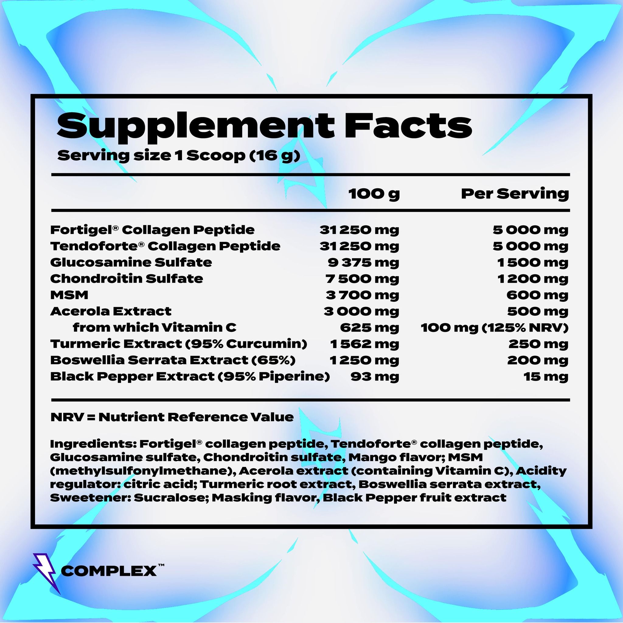 Fortigel® collagen peptide, Tendoforte® collagen peptide, Glucosamine sulfate, Chondroitin sulfate, Mango flavor, MSM (methylsulfonylmethane), Acerola extract (obsahující vitamín C), regulátor kyselosti: kyselina citronová, extrakt z kurkumy, extrakt z boswellie, sladidlo: sukralóza, maskující aroma, extrakt z černého pepře.