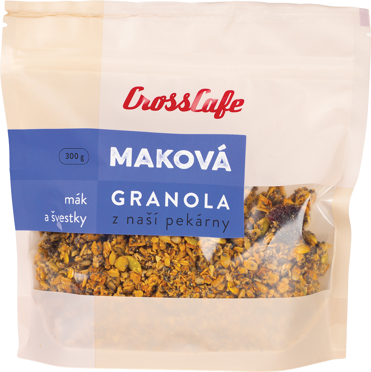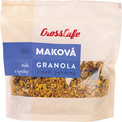 Lahodné zapékané müsli s mákem, švestkami a brusinkami. Společně s dýňovými semínky, kokosovými lupínky, medem, máslem a javorovým sirupem tvoří perfektně chuťově vyváženou snídani, která zasytí. Granoly vyrábí v CrossCafe podle receptur kreativního šéfkuchaře Luboše Martínka.