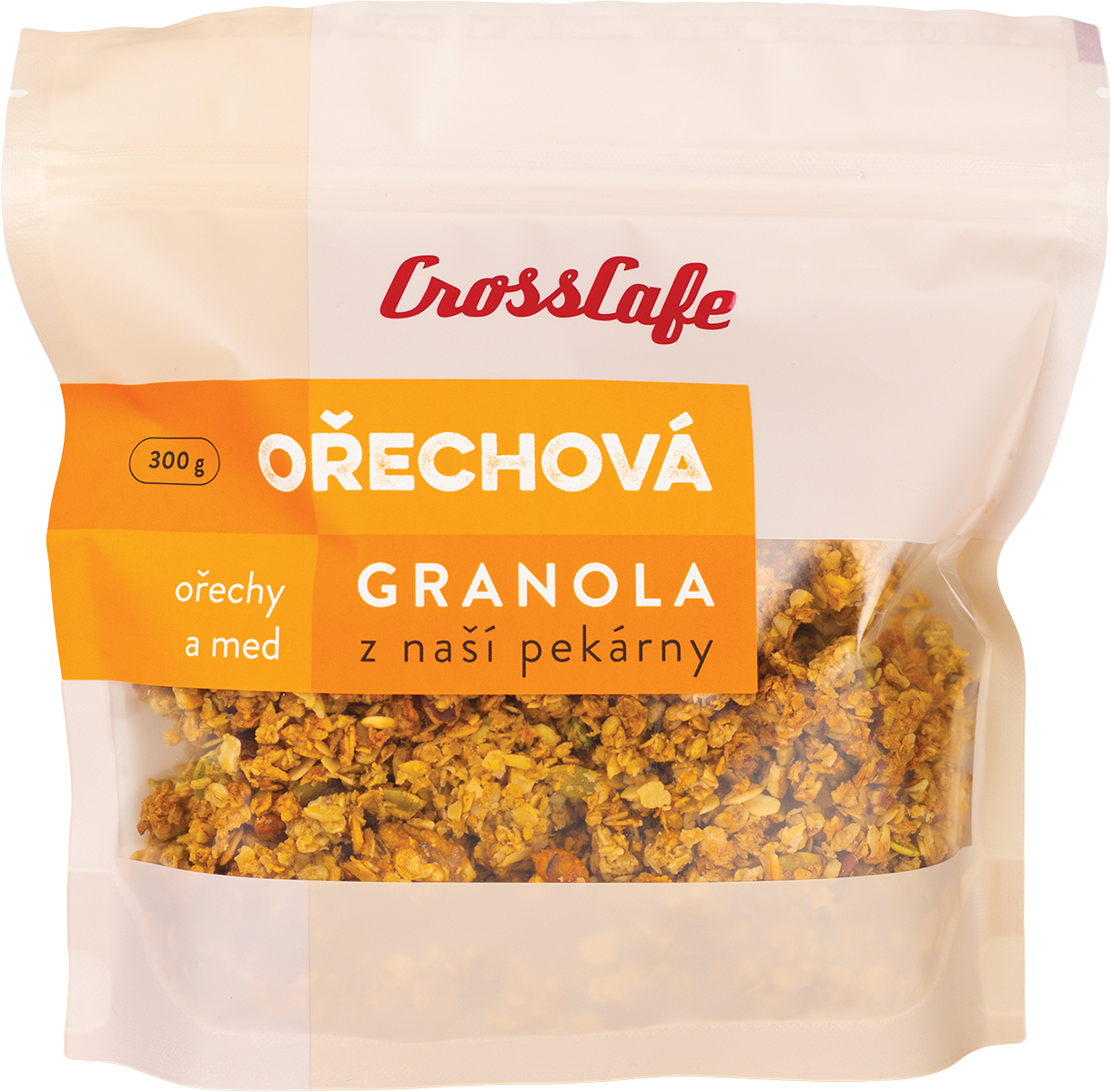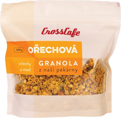 Křupavé ovesné vločky zapékané s medem, vlašskými a pekanovými ořechy, máslem, kokosovými lupínky, slunečnicovými a dýňovými semínky. Vše dochucené javorovým sirupem a skořicí. Granoly vyrábí v CrossCafe podle receptur kreativního šéfkuchaře CrossCafe Luboše Martínka.
