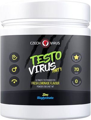 Produkt Testo Virus Part 1 nabízí originální kombinaci složení pro optimalizaci testosteronu. Přispívá k normální plodnosti a reprodukci a k udržení normální hladiny testosteronu v krvi. Produkt kombinuje extrémní množství kyseliny D-asparagové se zinkem ve formě bisglycinátu (chelát), bóru a vitamínu D3 (tzv. prohormon). Optimalizace testosteronu by měla být jednou z priorit pro tvrdě trénující jedince, jelikož se od ní odvíjí nepřeberné množství akcí v našem těle. Na základě nejednoho výzkumu je bohužel zřejmé, že mají muži v dnešní době snízené hladiny testosteronu v porovnání s muži pár dekád zpátky. Snížený testosteron má na svědomí naše doba, jsme více obézní, působí na nás více stresu z uspěchané doby a v neposlední řadě do sebe dostáváme více chemických věcí (například BPA nebo Triclosan) ať už potravou nebo jiným způsobem.