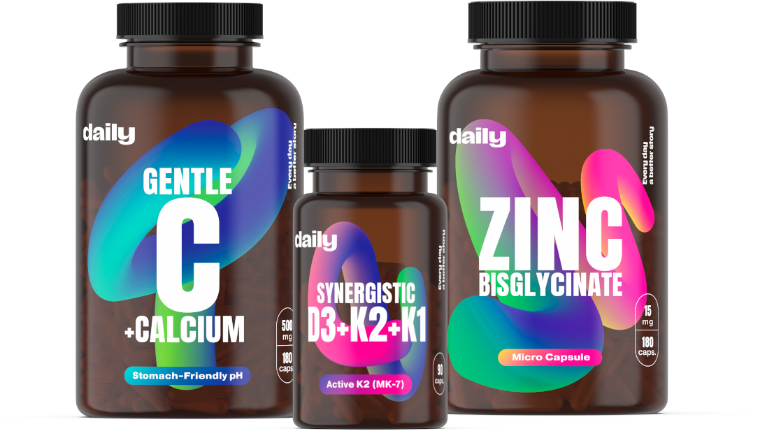 Daily kompletní imunita spojuje tři klíčové doplňky a to šetrný vitamin C ve formě calcium ascorbátu, komplex vitaminu D3 +K1+K2 pro lepší využití vápníku a čistý bisglycinát zinku s vysokou vstřebatelností. Společně podporují přirozenou obranyschopnost, jsou šetrné k trávení a vyrobené v Česku bez syntetik a plnidel.