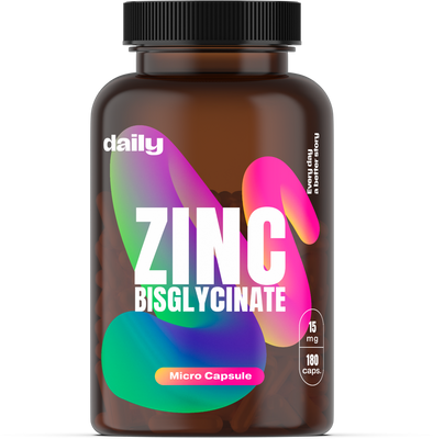 Zinc Bisglycinate by Daily je doplněk s vysokou vstřebatelností a šetrností k zažívání. Obsahuje 15 mg zinku ve formě MagChel® bisglycinátu – organicky vázané sloučeniny, kterou tělo snadno rozpozná a využije. Zinek přispívá k normální funkci imunitního systému, zdraví pokožky, vlasů, nehtů i reprodukčního systému.