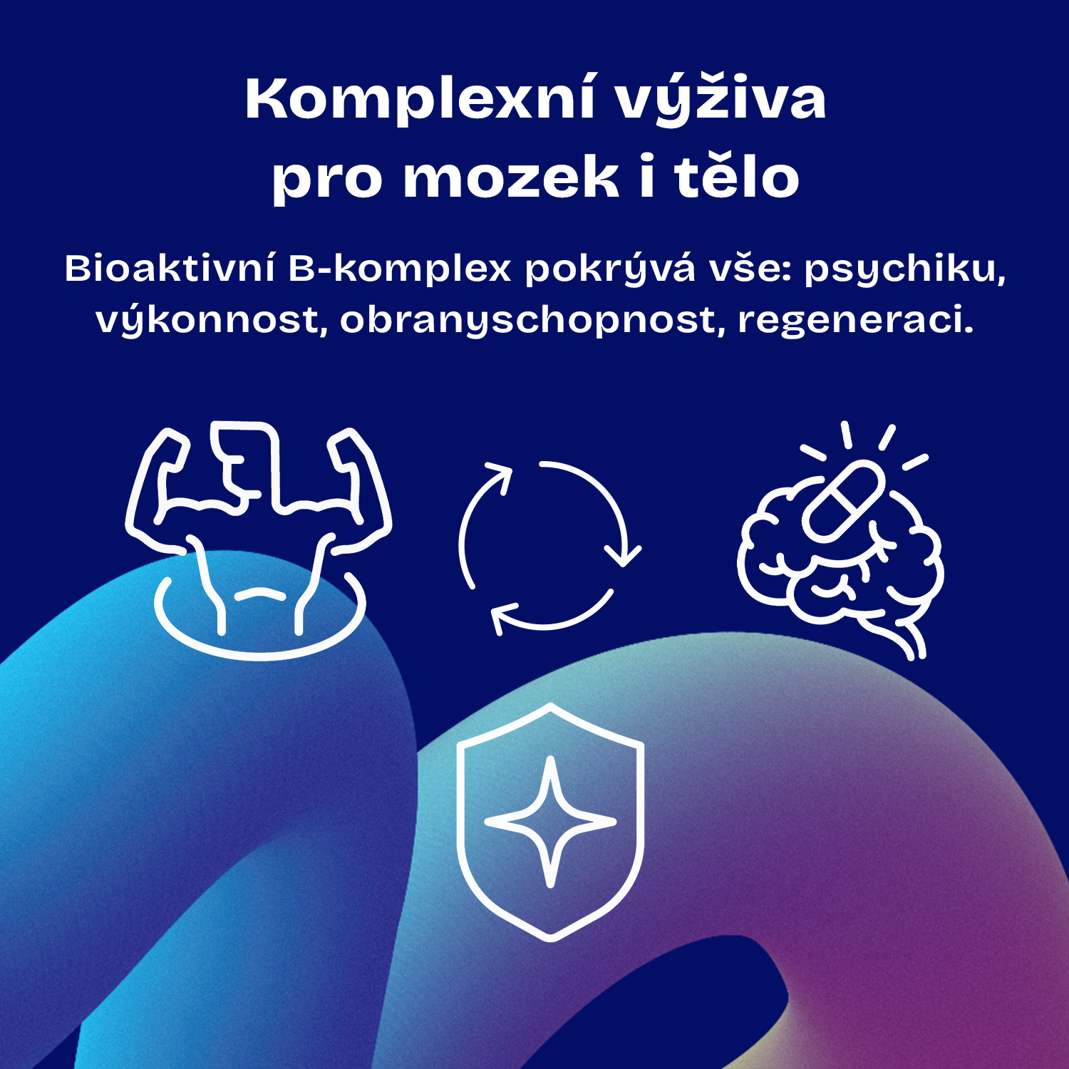 Vitaminy skupiny B přispívají k normální činnosti nervového systému, psychické pohodě, energetickému metabolismu a normálnímu stavu pokožky, vlasů a nehtů. Tento produkt je ideální pro každodenní použití – jako vyvážený základ pro každého, kdo žije v tempu.
