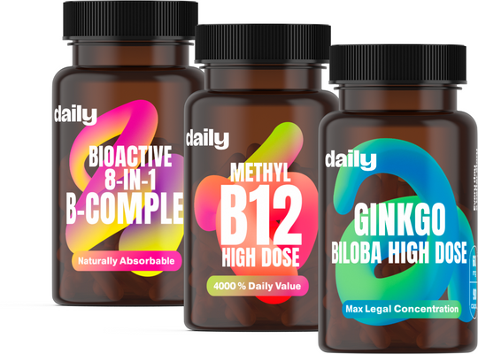 Daily soustředění a paměť kombinuje kompletní B-komplex v bioaktivních formách, vysokou dávku vitamínu B12 (methylkobalamin) a koncentrovaný extrakt z Ginkgo biloby. Společně přinášejí chytré doplnění vitaminů skupiny B a rostlinných látek známých svou rolí v podpoře paměti a soustředění. Vše vyrobeno v Česku, bez zbytečností a příměsí.