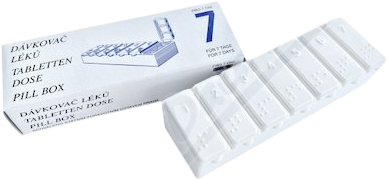 Dávkovač léků pro 7 dní je dělené pouzdro, které slouží k dočasnému ukládání léků v pevné formě. Je označen symboly zobrazujícími jednotlivé dny v týdnu. Dny v týdnu jsou rozděleny tak, že umožňují uložení léků na ráno-poledne-večer. Barva bílá. Více informací