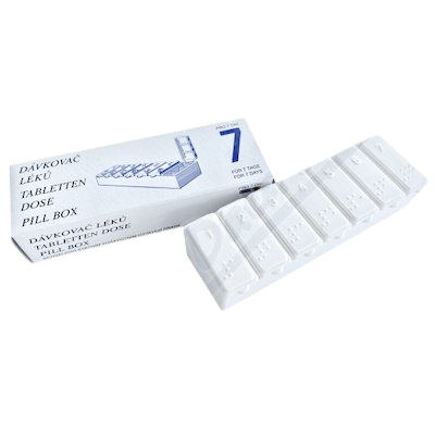 - Týdenní dávkovač léků – Obyčejný zásobník na léky na 7 dní sestavený z jednoho kusu.