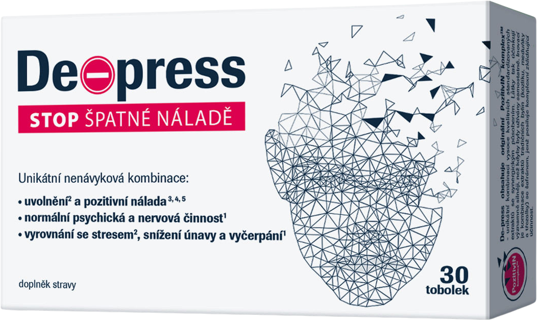 Přípravek De-press obsahuje silnou dávku kozlíku lékařského pro dosažení duševní pohody, vyrovnání se stresem a šafrán setý pro dosažení dobré nálady. Funkčnost doplňku stravy synergicky doplňuje vitamin B6 a hořčík v kombinaci s extrakty 4 bylin a L-tryptofanem. Více informací
