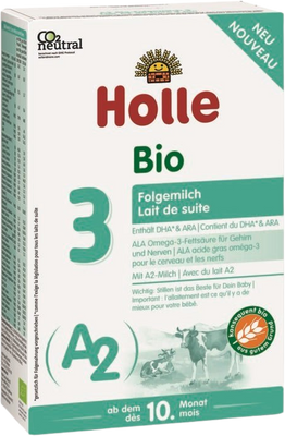 HOLLE Bio – A2 pokračovací mléko 3. od 10. měsíce věku s ALA Omega 3 mastými kyselinami pro podporu zdraví a nervové soustavy. Obsahuje DHA & ARA, vybraný syrovátkový protein a mix kaseinů. Je vhodné i jako doplněk kojení. Více informací
