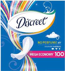 Zůstaňte s neparfémovanými intimkami Discreet Multiform Air svěží a krásná, ať už je váš styl jakýkoliv! Tyto intimky umožňují pokožce v intimních partiích přirozeně dýchat a zajišťují tak až 12 hodin svěžesti a pohodlí. Jsou tak tenké a flexibilní, že je ani neucítíte. Navíc díky svému flexibilnímu provedení se přizpůsobí každému střihu spodních kalhotek. Ať už vám den přinese cokoliv, přizpůsobí se vašemu pohybu. Více informací