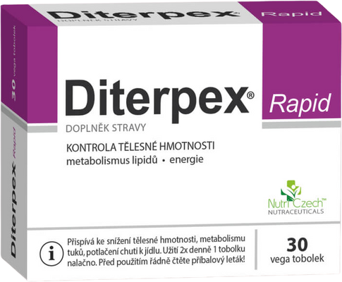 Diterpex® Rapid přispívá ke kontrole tělesné hmotnosti, metabolismu lipidů (tuků), potlačení chuti k jídlu. Pomáhá zvýšit čilost, bystrost a vytrvalostní výkon. Vhodný pro osoby s BMI 25 a vyšší. Při užívání je vhodné zařadit mírnou nízkokalorickou stravu se sníženým obsahem tuků. Více informací