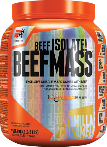 Značkový hovězí proteinový izolát HydroBEEF® (hydrolyzované hovězí peptidy) s obsahem 97 % hovězích bílkovin tvoří proteinový základ gaineru BeefMass ®. Ten jsme doplnili kvalitním matrixem sacharidů pro maximální nárůst síly a svalové hmoty. BeefMass ® je nový gainer, který obsahuje hydrolyzovanou izolovanou hovězí bílkovinu, jejíž předností je prakticky nulový obsah tuku a cukru. Hovězí proteinový izolát HydroBEEF® je jeden z nejkvalitnějších bílkovinných zdrojů. Užívání hovězí bílkoviny má v silových sportech dlouhou tradici. BeefMass ® je určen pro všechny, kdo usilují o nárůst svalové hmoty a síly.