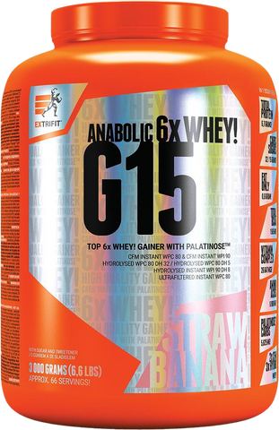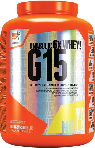 G15 Anabolic Gainer je pokročilejší a zdokonalenou verzí populárního gaineru G 15! Jedná se o vynikající prostředek pro každého, kdo chce velmi rychle zvýšit hmotnost a objem svalstva. Proteinovou složku jsme vyladili tak, že nyní obsahuje ty nejlepší proteiny vůbec! Výhradně whey (syrovátkové) koncentráty a izoláty a 3 hydrolyzované syrovátkové proteiny s vynikající využitelností pro růst svalové hmoty. G 15 obsahuje 15% Top proteinů a 71% velmi kvalitních sacharidů s postupným nástupem účinku.