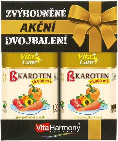 Mimořádné promo balení 1+1 (100+100 tobolek) obsahuje 2 kusy přípravku Beta karoten 10.000 m.j. (6 mg) - 100 tob. za cenu jednoho kusu tohoto přípravku. Karoteny jsou látky ze skupiny karotenoidních barviv, z nichž nejrozšířenější a nejznámější je beta karoten.