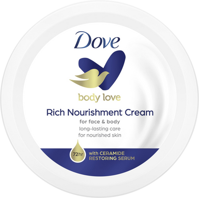 Dove Body Love Rich Nourishment, krém na obličej a tělo 150 mlVše o produktuDoplňující informaceHodnocení produktuVýživný krém Dove je výborný hydratační krém pro všestranné použití, který je určen pro hýčkání celého těla. Rychlé vstřebávání a výborná hydratace jsou zárukou lepší péče o pokožku. Nový výživný víceúčelový krém je určen pro každodenní použití pro všechny typy pleti. Dove výživný krém je určen pro použití na ruce, tělo i obličej. Vyznačuje se příjemnou a nevtíravou vůni a snadným otevíráním.
