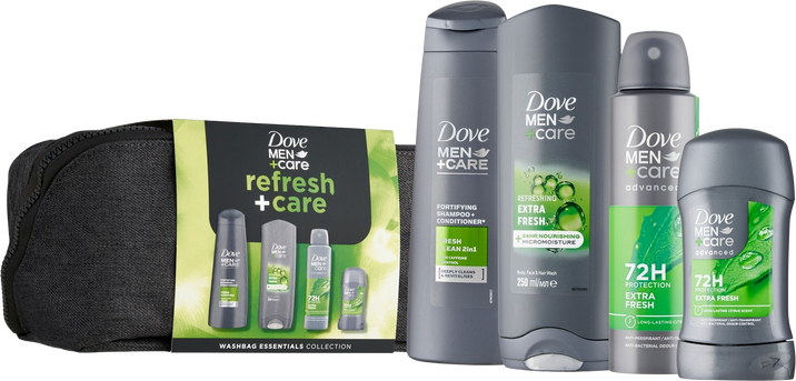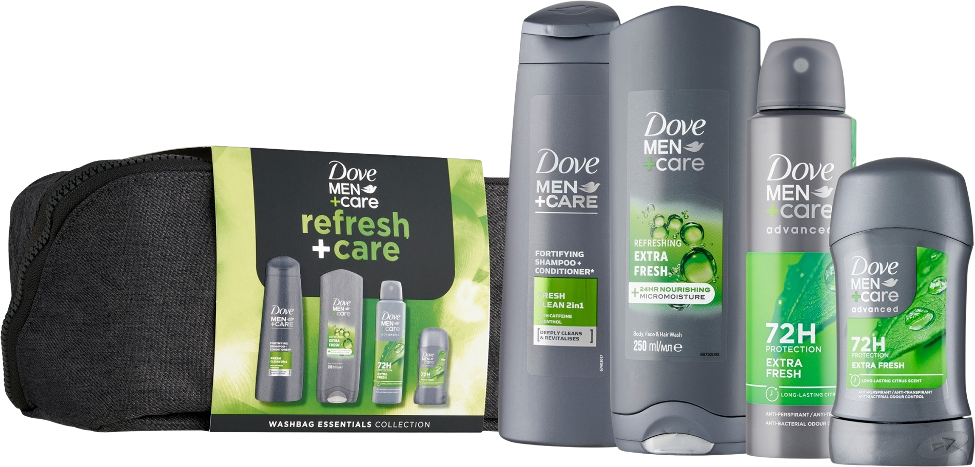 Dove Men Refresh + Care dárková sada tělové péčeVše o produktuDoplňující informaceHodnocení produktuPečující produkty Dove Men+ dodají vaší pokožce hydrataci, ochranu a dlouhotrvající pocit jasnosti. Jedinečné složení Extra Fresh Sprchového Gelu s technologií MicroMoisture se aktivuje napěněním gelu, čímž pomáhá uzamknout přirozenou vlhkost pokožky a zanechává ji svěží a hydratovanou. Zároveň je tak šetrný, že jej můžete použít i k péči o pokožku obličeje. Extra Fresh Antiperspirant Spray pomáhá bojovat proti potu a tělesnému pachu po dobu až 72 hodin. Technologie 1/4 hydratačního krému pomáhá chránit pokožku před podrážděním. Dopřejte svým blízkým dárek pod stromečkem, který se postará o jejich pohodlí a bude je hýčkat i během svátků.