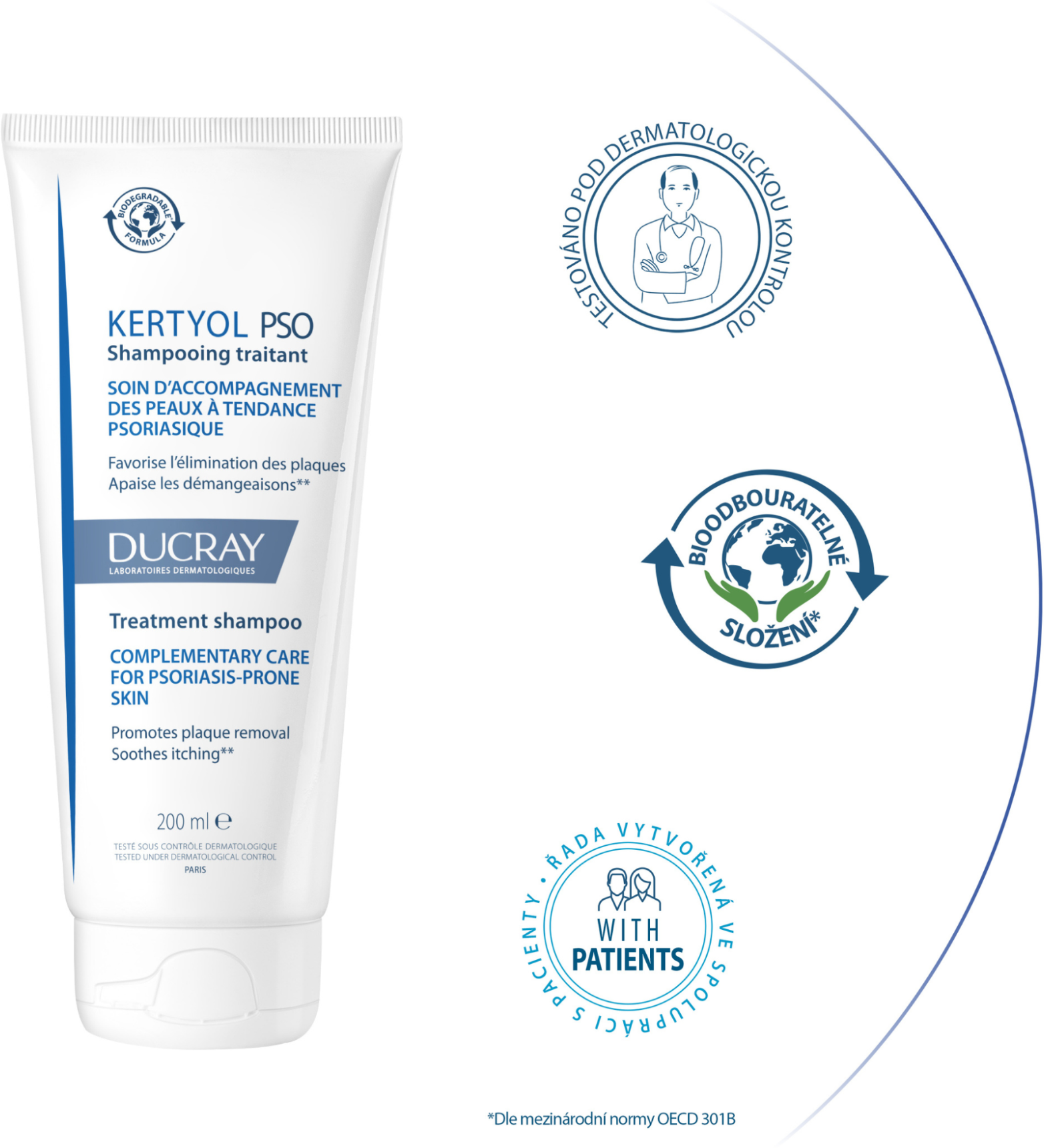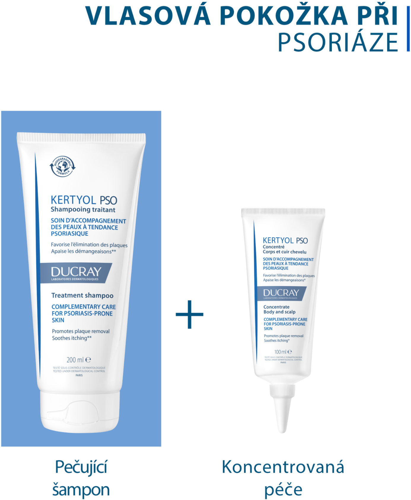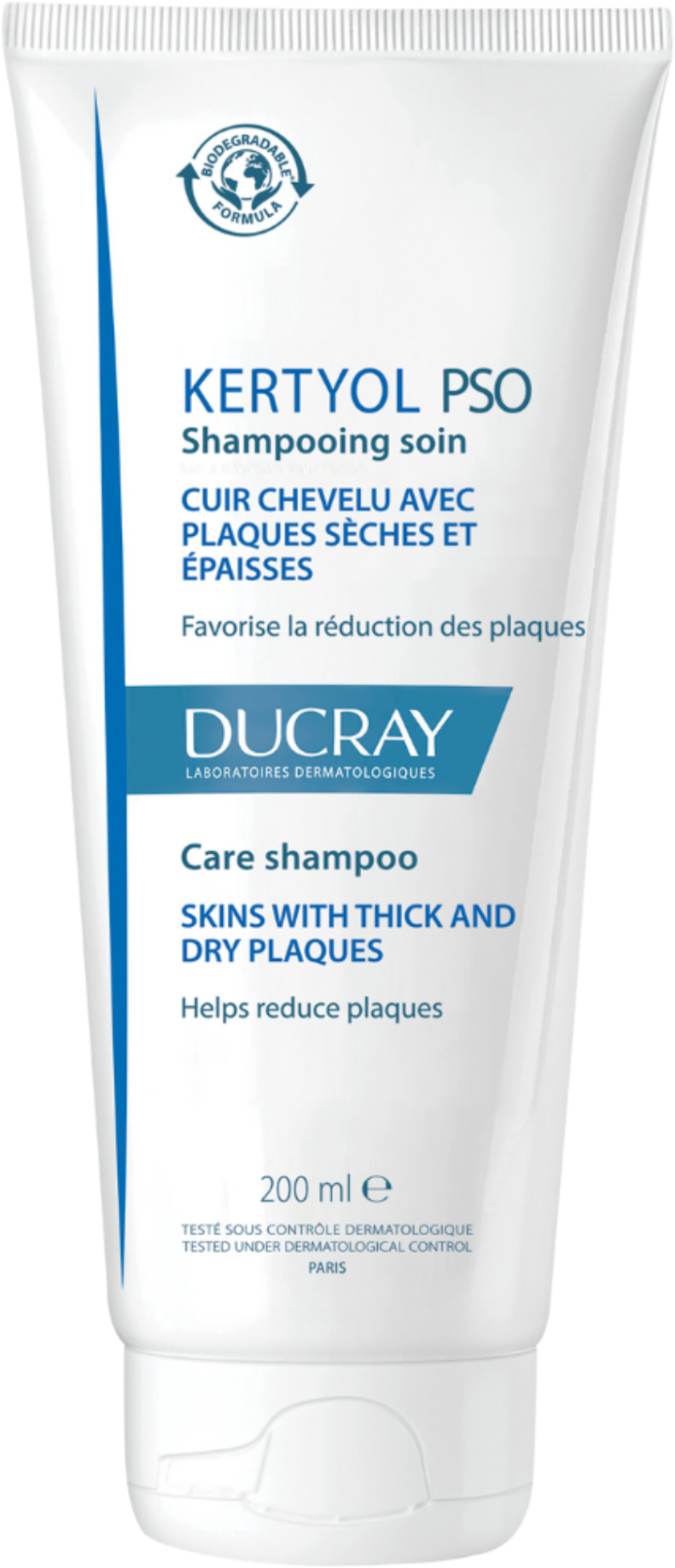 Pečující šampon navracející rovnováhu vlasové pokožce je vhodný jako doplňková péče při psoriáze pro vlasovou pokožku s plaky suchých a silných lupů, které jsou někdy doprovázeny intenzivním svěděním. Šupiny na těle a ve vlasové pokožce jsou výsledkem příliš rychlé obnovy buněk horní vrstvy pokožky. Tyto buňky se hromadí na povrchu kůže a vytváří tak plaky, které mohou být doprovázeny intenzivním svěděním. Na povrchu těchto plaků se objevují bělavé šupiny (skvamy) jako silnější lupy. Šampon Kertyol PSO podporuje odstraňování suchých plaků a zároveň zklidňuje pocity svědění a zmírňuje zarudnutí. Jeho snášenlivost byla testována v kombinaci s medikamentózní léčbou při psoriáze.