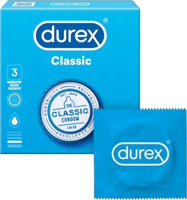 Durex kondomy Classic se díky technologii Easy-On snadno nasazují a lubrikační složka poskytuje větší komfort během intimních chvil. Jsou vyrobeny z přírodního kaučuku a dermatologicky testovány. Poskytují intenzivní zážitek při pohlavním styku. V malém balení, 3 ks. Pro rozkoš a pohodlí – takové jsou kondomy Durex.
