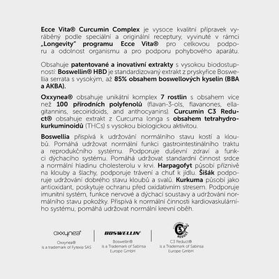Curcumin komplex obsahuje formu kurkuminu (THCs – tetrahydrokurkuminoidy) s vynikající vstřebatelností, dále extrakt z Boswellia serrata (Boswellin® HBD), komplex více než 100 přírodních polyfenolů Oxxynea® a další podporující bylinné složky jako MSM, harpagofyt, šišák a zázvor.