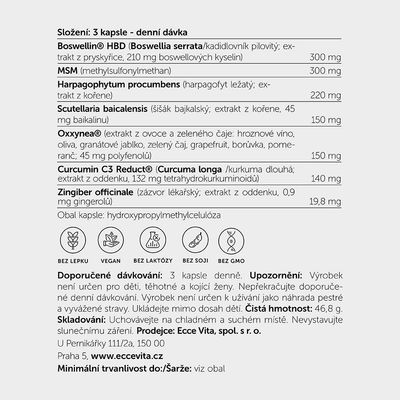 Tři kapsle obsahují kombinaci pečlivě vybraných rostlinných extraktů a aktivních látek: Boswellin® HBD (extrakt z pryskyřice Boswellia serrata) 300 mg, který přirozeně obsahuje 210 mg boswellových kyselin, MSM (methylsulfonylmethan) 300 mg, extrakt z kořene Harpagophytum procumbens (harpagofyt ležatý) 220 mg, extrakt z kořene Scutellaria baicalensis (šišák bajkalský) 150 mg s obsahem 45 mg baikalinu, Oxxynea® 150 mg – směs extraktů z ovoce a zeleného čaje (hroznové víno, oliva, granátové jablko, zelený čaj, grapefruit, borůvka a pomeranč) s obsahem 45 mg polyfenolů, Curcumin C3 Reduct® – extrakt z oddenku kurkumy dlouhé (Curcuma longa) 140 mg s obsahem 132 mg tetrahydrokurkuminoidů a extrakt ze zázvoru lékařského (Zingiber officinale) 19 mg s obsahem 0,9 mg gingerolů.