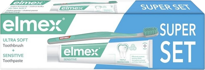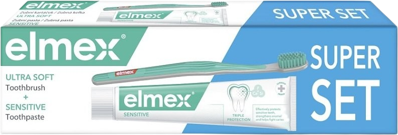 Sada zubního kartáčku elmex Ultra Soft a zubní pasty elmex Sensitive usnadňuje šetrnou péči o zuby. Elmex Ultra Soft zubní kartáček má jemná vlákna, která šetrně čistí citlivé zuby a dásně, a snadno se dostává do těžko přístupných míst. Zubní pasta elmex Sensitive nabízí 24hodinovou ochranu citlivých zubů, zuby posiluje a šetrně čistí (při pravidelném čištění 2x denně).