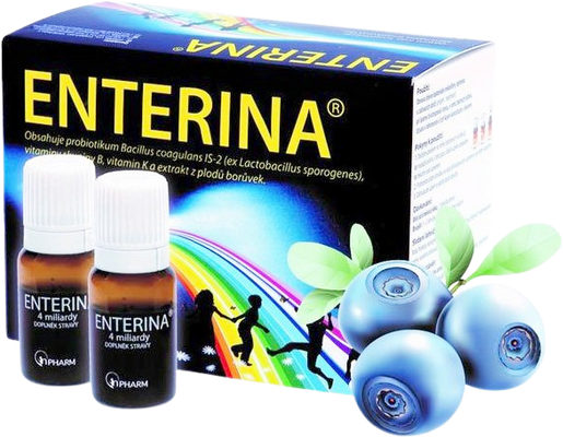 Sliznice trávicího ústrojí je za normálního stavu udržována v rovnováze, tzn. je osídlena prospěšnými bakteriemi. Normální flóra ve správném množství pozitivně ovlivňuje fungování organismu a produkuje vitaminy. Tuto rovnováhu mohou narušit různé změny (např. změna stravy, působení antibiotik). Narušená rovnováha se obvykle projevuje střevním diskonfortem. Přípravek Enterina přispívá k udržení normálního stavu sliznic (vit. B2, B3) a dodává organismu důležité vitaminy. Doplněk stravy, látky obsažené v tomto přípravku přispívají také ke snížení míry únavy a vyčerpání (vit. B2, B6, B12). Spolu s obsaženým probiotikem a vhodné zejména při stavech střevního diskomfortu.