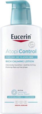 Eucerin AtopiControl Tělové mléko je tělové mléko pro každodenní použití, které bylo vyvinuto speciálně pro zklidnění a intenzivní hydrataci podrážděné a svědící pokožky. Tělové mléko na bázi voda-v-oleji se snadno vstřebává a je obohaceno o uklidňující Licochalcon A, ceramidy a omega oleje k posílení kožní bariéry, zmírnění vysušování a svědění a prodloužení doby mezi vzplanutími atopické dermatitidy. Při pravidelném používání dochází k výraznému zlepšení stavu pokožky, která je na dotek jemná a hladká. Eucerin AtopiControl Tělové mléko neobsahuje parfemaci a můžete jej používat i společně s Eucerin AtopiControl Acute krémem v průběhu akutních vzplanutí.