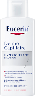 Eucerin Dermo Capillaire Hypertolerantní šampon 250 mlVše o produktuDoplňující informaceHodnocení produktuŠampon Eucerin DermoCapillaire Hypertolerant je speciálně navržen pro osoby s velmi citlivou pokožkou hlavy. Jeho velmi jemné složení poskytuje mimořádně šetrné mytí vlasů a zároveň chrání pokožku hlavy před vysoušením a podrážděním – i když máte hyperreaktivní nebo alergickou pokožku hlavy. Zklidňuje pokožku hlavy a zmírňuje svědění již od prvního použití.