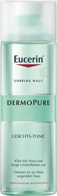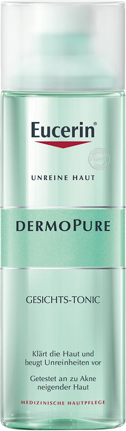 Eucerin® DERMOPURE Čisticí pleťová voda tonizuje pleť a poskytuje intenzivní čištení T-zóny a dalších problematických partií obličeje. Složení obsahuje kyselinu mléčnou, která šetrně uvolňuje póry bez přílišného vysušování. Nekomedogenní. Komedolytický úcinek.