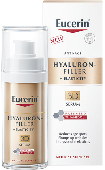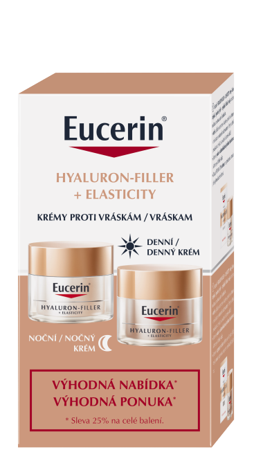 Řada výrobků Eucerin ELASTICITY+FILLER byla vyvinuta speciálně pro řešení obou těchto problémů a přináší hned několik omlazujících účinků. Denní i noční krém této řady obsahují arctiin (aktivní složka, která prokazatelně urychluje obnovu kolagenu v buňkách pleti) a silymarin (vysoce účinný antioxidant, který chrání před rozpadem kolagenových a elastinových vláken a zlepšuje prokrvení pleti na buněčné úrovni). Složení obsahuje také kyselinu hyaluronovou pro viditelné vyplnění vrásek. Vedle pečujících krémů je součástí řady také vyhlazující pleťové olejové sérum s bohatým obsahem esenciálních olejů.