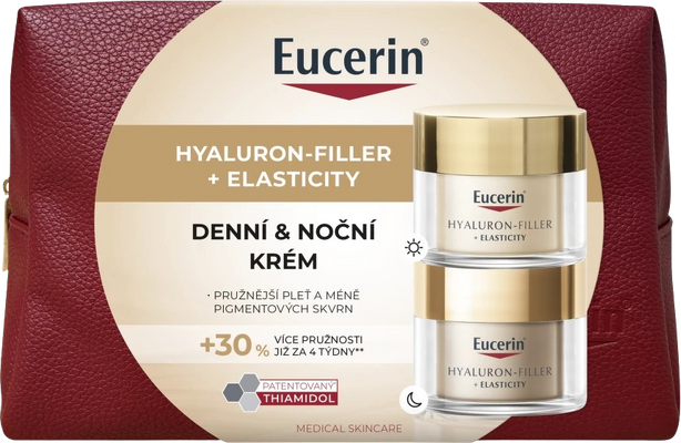 Elegantní dárková sada Eucerin Hyaluron-Filler + Elasticity obsahuje duo účinné péče – denní a noční krém určený pro zralou pleť. Oba produkty jsou navrženy tak, aby zlepšovaly pevnost a pružnost pokožky a zároveň zmírňovaly výskyt vrásek. Více informací