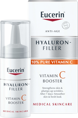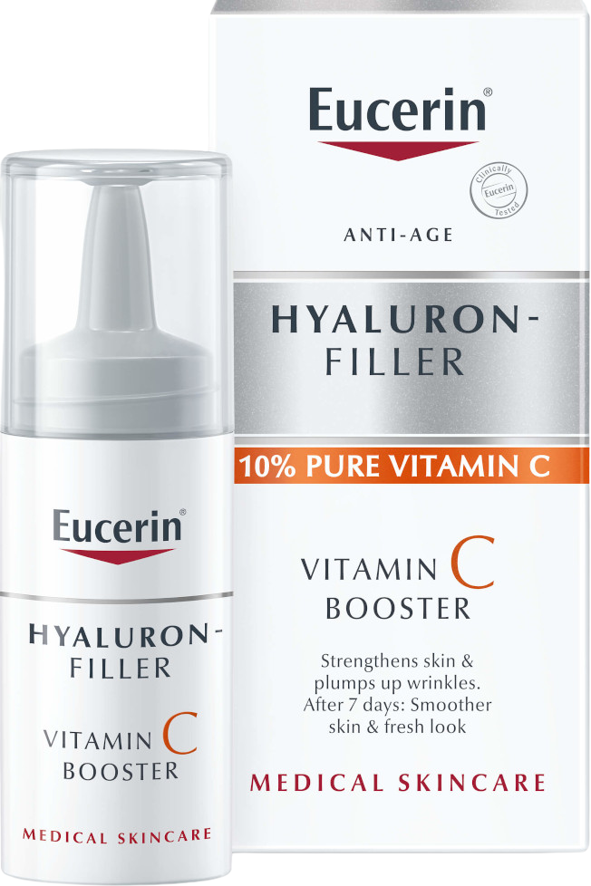Slunce, znečištěné ovzduší, kouření a další faktory našeho životního stylu vyvolávají tvorbu volných radikálů. Volné radikály způsobují v pleti oxidační stres, urychlují její předčasné stárnutí a zanechávají pleť na pohled mdlou a unavenou. Eucerin Hyaluron-Filler Vitamin C Booster s 10% čistým a čerstvě aktivovaným vitamínem C byl vyvinut speciálně pro ochranu pleti proti volným radikálům a účinek proti prvním známkám stárnutí: pleť povzbuzuje, vyplňuje vrásky a vy získáte hladší, svěžejší a zářivější vzhled.