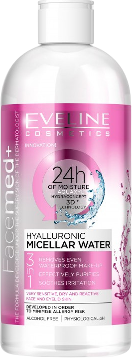 Hyaluronová micelární voda odstraňuje i voděodolný make-up, hluboce očituje a zklidňuje podráždění. Vhodná pro velmi citlivou, suchou tvář i oční víčka, vytvořeno s doporučením dermatologa. Více informací