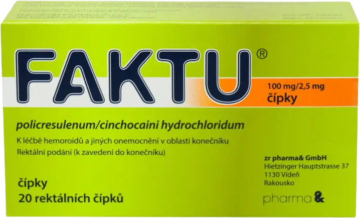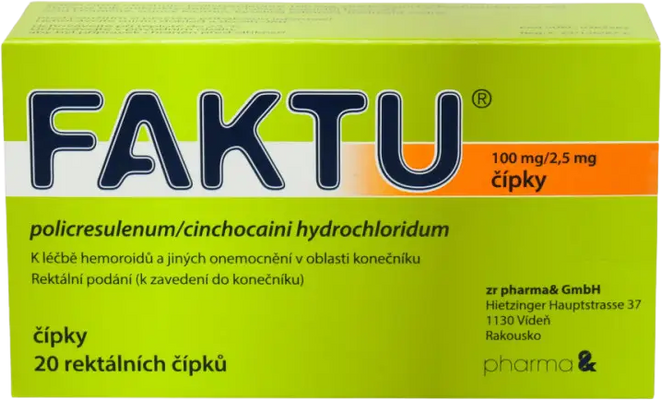 Léčivou látkou přípravků Faktu mast a Faktu čípky je polykresulen a cinchokain. Přípravek Faktu rychle zastavuje krvácení, svědění a pálení při hemoroidech a dalších obtížích v oblasti konečníku. Zabraňuje vzniku zánětu a podporuje regeneraci postižené oblasti. Cinchokain způsobuje místní znecitlivění, čímž snižuje bolest a svědění v oblasti konečníku. Více informací
