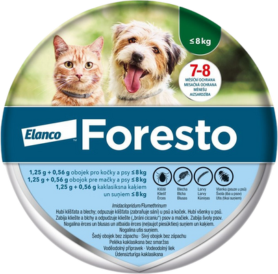 Foresto® není tradiční obojek proti blechám a klíšťatům. Využívá nově vyvinutou směs materiálů, která umožňuje bezpečné řízené uvolňování nízkých dávek účinných látek po dobu až 8 měsíců. Tak kočku a psa dokonale chrání nejen tím, že blechy a klíšťata hubí, ale rovněž klíšťata odpuzuje dříve, než se přisají. Tak vašeho mazlíčka chrání před onemocněními, která tito paraziti mohou šířit.