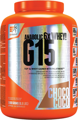 Extrifit G 15 Anabolic Gainer čokoláda kokos 3000 gVše o produktuDoplňující informaceHodnocení produktuG 15 obsahuje 15% Top proteinů a 71% velmi kvalitních sacharidů s postupným nástupem účinku. Jedná se o unikátní produkt pro zvyšování váhy! G 15 anabolic Gainer není jen jedním z řady běžných gainerů!