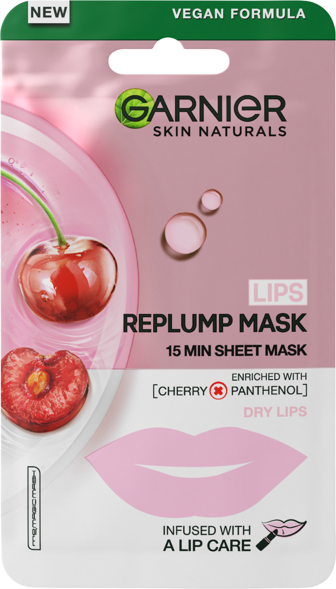 Vyplňující textilní maska na rty s výtažkem z třešně a panthenolem. Pro vyplněné, hydratované a vyhlazené rty již za 15 minut.