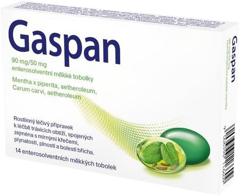Gaspan 90mg/50mg enterosolventní 14 měkkých tobolekVše o produktuDoplňující informaceHodnocení produktuPřípravek Gaspan je rostlinný léčivý přípravek k léčbě gastrointestinálních obtíží, spojených zejména s mírnými křečemi, plynatostí, bolesti břicha a pocitem plnosti. Přípravek je určen pro dospělé a dospívající od 12 let.