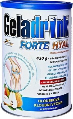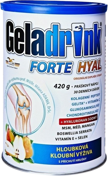 - Geladrink FORTE HYAL je zdrojem látek s nutričním a fyziologickým účinkem doplňujícím běžnou stravu a lze jej užívat k ověřené a komplexní výživě kostí a chrupavek kloubů