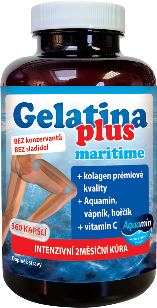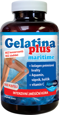 Gelatina Plus Maritime je doplněk stravy ve formě kapslí, který obsahuje komplex kolagenu, minerálních látek a vitamin C. Neobsahuje konzervanty a sladidla. Vápník a hořčík jsou potřebné pro udržení normálního stavu kostí a svalů. Vitamin C přispívá k normální tvorbě kolagenu pro normální funkci kostí a chrupavek. Více informací
