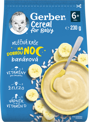 GERBER Cereal mléčná kaše banánová Dobrou noc je kombinací vysoce kvalitní rýžové mouky, jemné chuti banánu a vitamínů, která uspokojí potřeby děťátka i jeho mlsný jazýček. Neobsahuje lepek, tudíž je vhodným začátkem pro každé malé bříško v době prvních příkrmů. Kaše je vhodná pro kojence od ukončeného 6. měsíce. Více informací