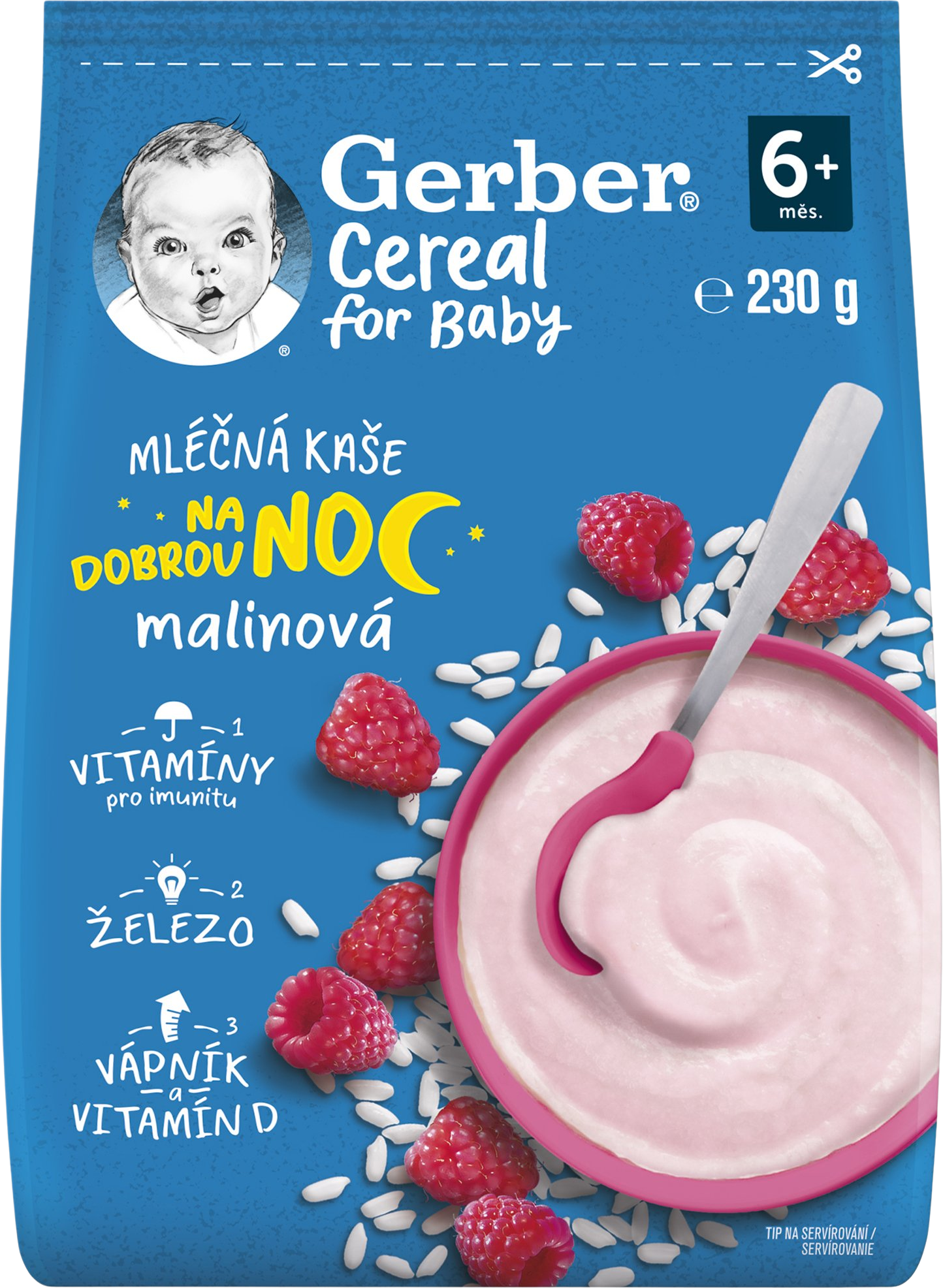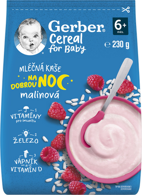 GERBER Cereal mléčná kaše malinová Dobrou noc je kombinací vysoce kvalitní rýžové mouky, jemné chuti malin a vitamínů, která uspokojí potřeby děťátka i jeho mlsný jazýček. Kaše je vhodná pro kojence od ukončeného 6. měsíce. Více informací