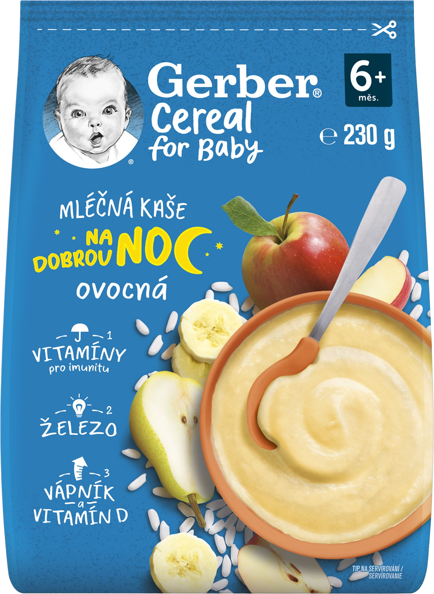 - Kaše GERBER Cereal Dobrou noc kombinují vysoké nároky na kvalitu pečlivě vybrané rýže a jemnou chuť ovoce pro potěšení všech malých bříšek