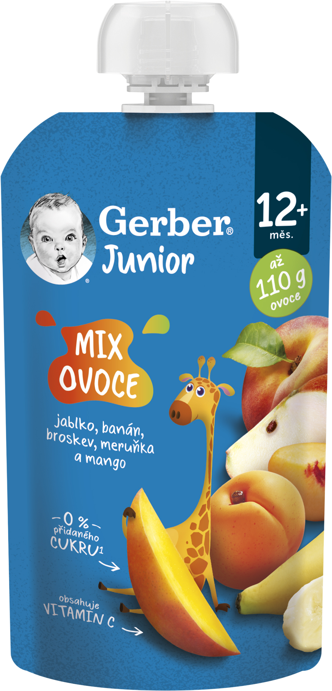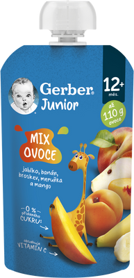 GERBER Junior kapsička Mix ovoce 110 g je lahodné ovocné pyré s bohatou chutí jablek, banánů, broskví, meruněk a manga. Každá porce obsahuje ovoce a vitamín C, který přispívá k normální funkci imunitního systému dítěte. Kapsička navíc neobsahuje žádný přidaný cukr* a je bez konzervačních látek**. Vaše malé děťátko si tak užije vynikající a přirozenou chuť ovoce.