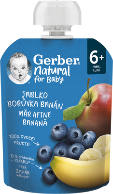 GERBER Natural kapsička jablko, borůvka a banán je ovocná přesnídávka do malé ručky, která potěší všechny mlsné jazýčky. V každé porci se nachází pečlivě vybrané ovoce: jablečné pyré 85,9 %, borůvkové pyré 9 %, banánové pyré 5 % a vitamín C. Více informací