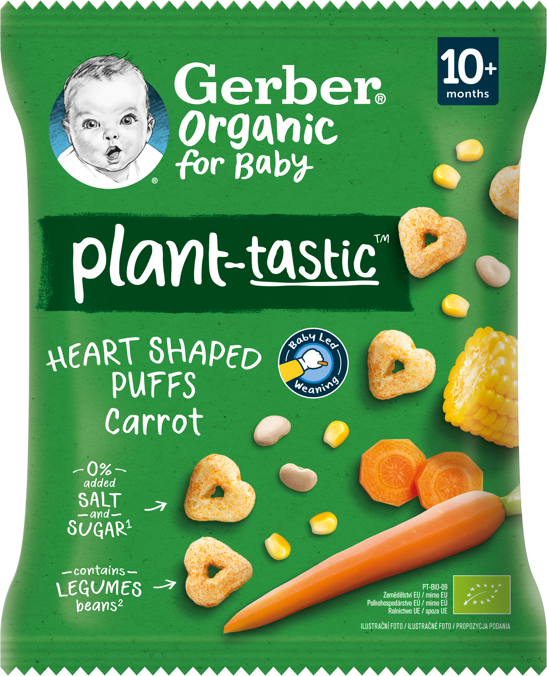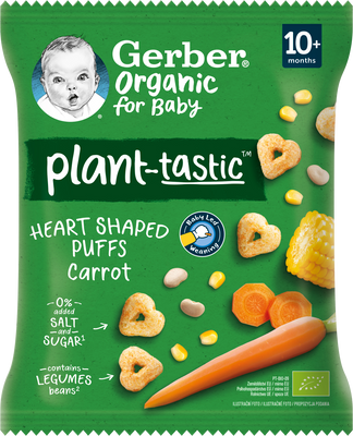 GERBER Organic křupavá srdíčka s mrkví jsou chutnou kombinací obilovin, luštěnin a zeleniny. Představují lahodnou svačinku, která je určená pro malé děti od ukončeného 10. měsíce.