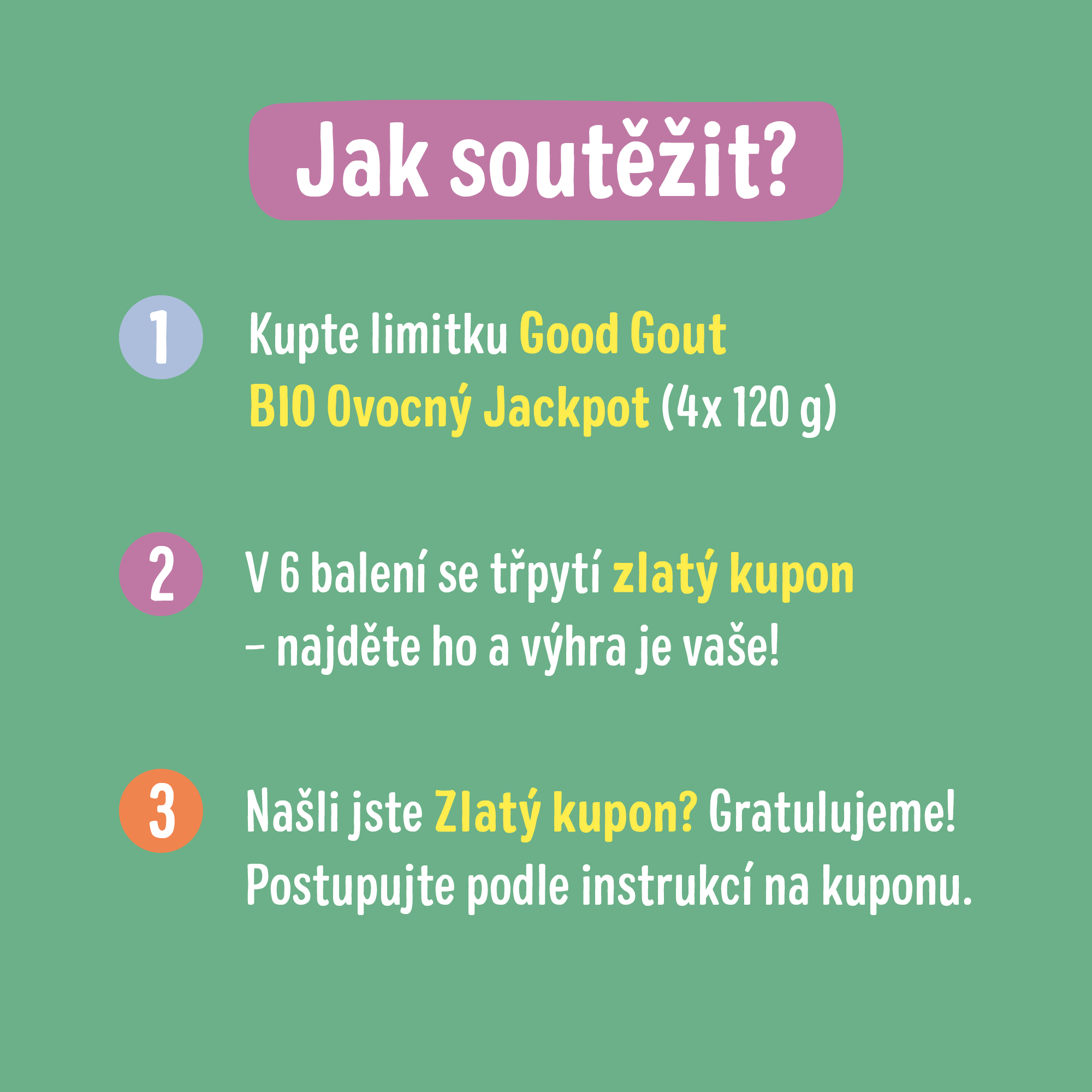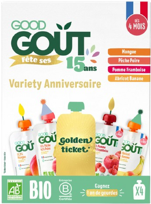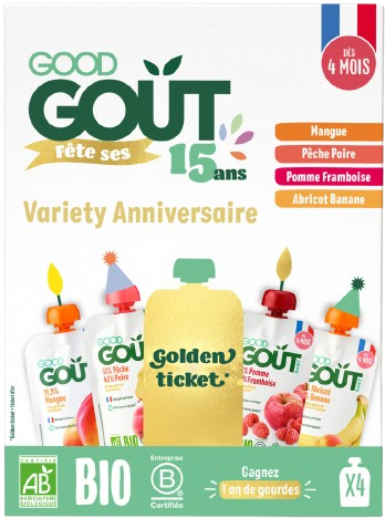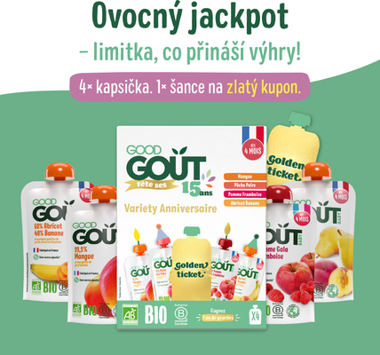 Tato edice obsahuje kapsičky Good Gout BIO Mango, BIO Broskev s hruškou, BIO Meruňka s banánem a BIO Jablko s malinou. A to není vše…V každém balení se ukrývá šance na výhru! Najděte zlatý kupon a získejte roční zásobu kapsiček Good Gout ZDARMA!