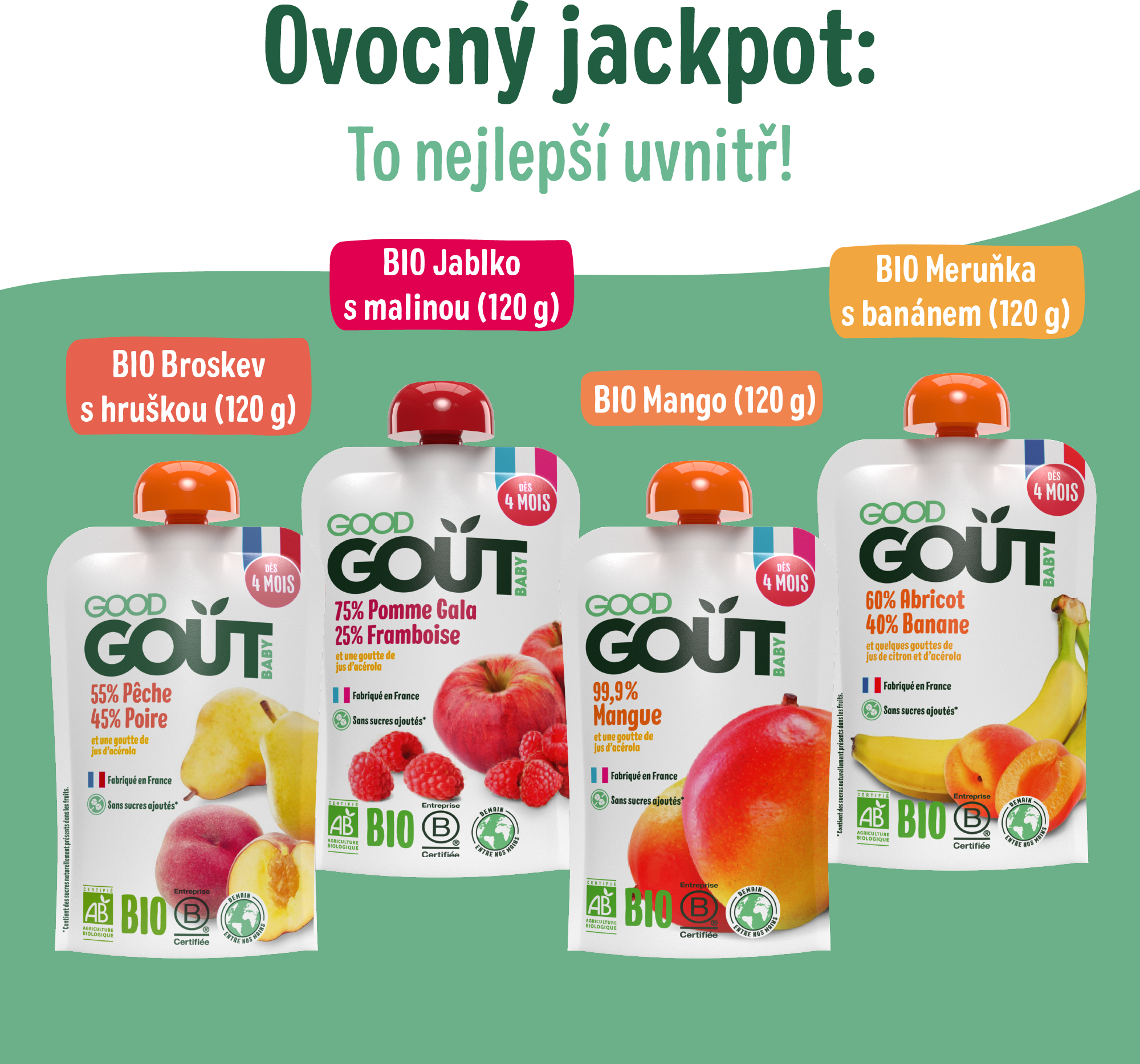 Good Gout BIO Jablko s malinou (120 g): 75 % *jablka Gala, 25 % *malin, koncentrát šťávy z *aceroly.