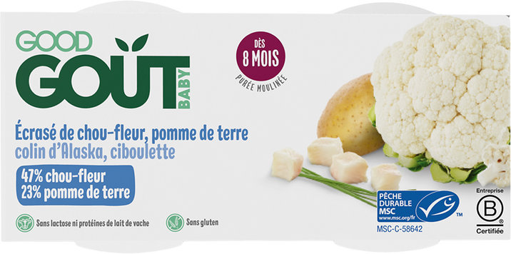 Good Goût BIO Treska pestrá s květákem a brambůrky 2 x 190 gVše o produktuDoplňující informaceHodnocení produktuDvojité květákové pokušení. Tak by se dala nazvat premiéra této kudrnaté zeleniny v Good Gout příkrmech v praktickém balení po dvou. Navíc s jemným rybím masíčkem tresky pestré, která pochází z udržitelného rybolovu, takže o ní nelze v žádném ohledu pochybovat.