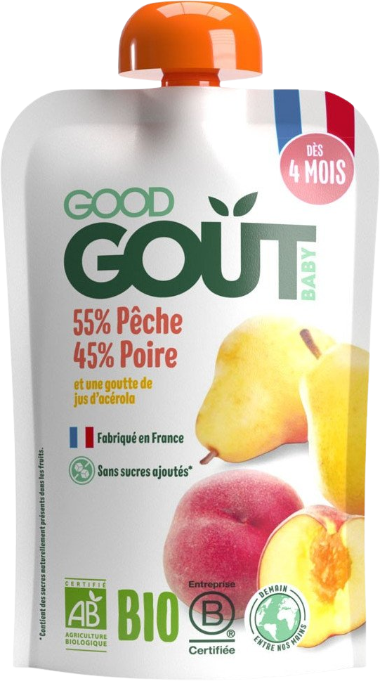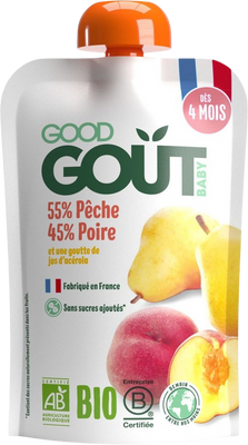 Broskvový Good Gout s hruškou je lahodný ovocný příkrm. Obohaťe vašim nejmenším jídelníček díky jemné broskvové chuti v harmonickém spojení s nasládlými hruškami Williams, je to velká dobrota. Pasterizováno, tepelně upraveno, bez lepku.