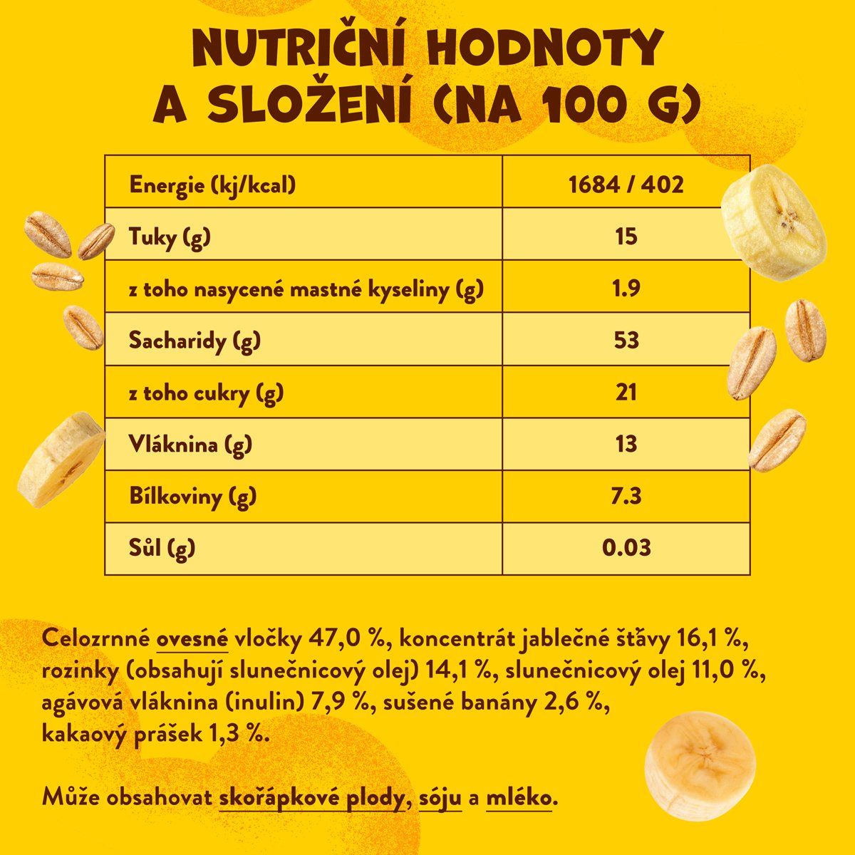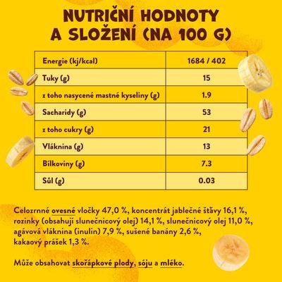 Celozrnné OVESNÉ vločky 47,0 %, koncentrát jablečné šťávy 16,1 %, rozinky (obsahují slunečnicový olej) 14,1 %, slunečnicový olej 11,0 %, agávová vláknina (inulin) 7,9 %, sušené banány 2,6 %, kakaový prášek 1,3 %. Může obsahovat SKOŘÁPKOVÉ PLODY, SÓJU a MLÉKO.